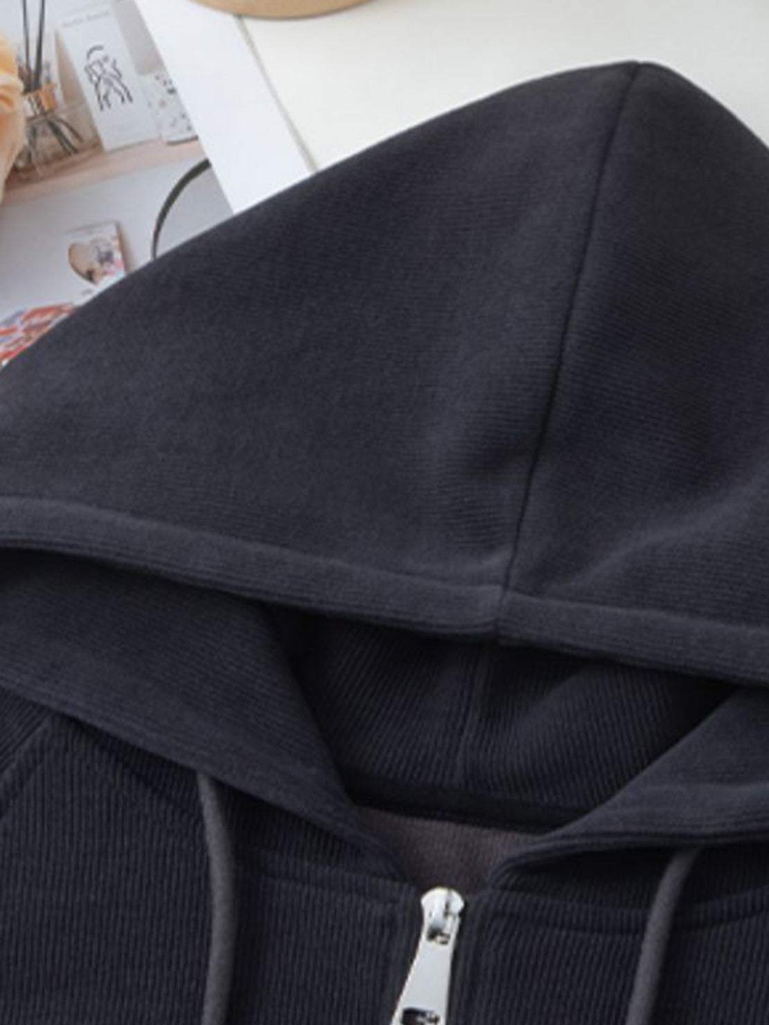 • Zip-front hoodie with drawstring hood