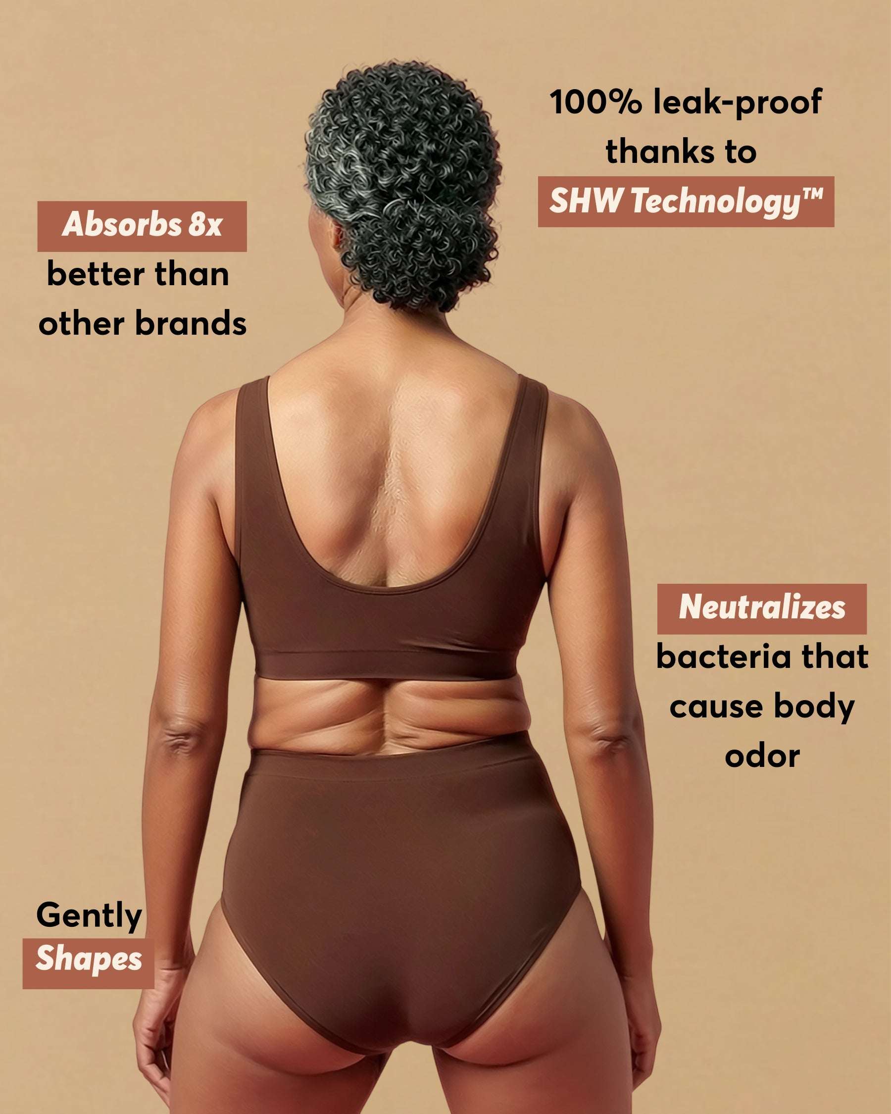 The nylon-spandex body stretches and recovers through any movement, while the cotton-lined crotch stays soft against skin all day. The inner gusset layer absorbs and locks in moisture without adding thickness. Wears like regular underwear from morning to night.