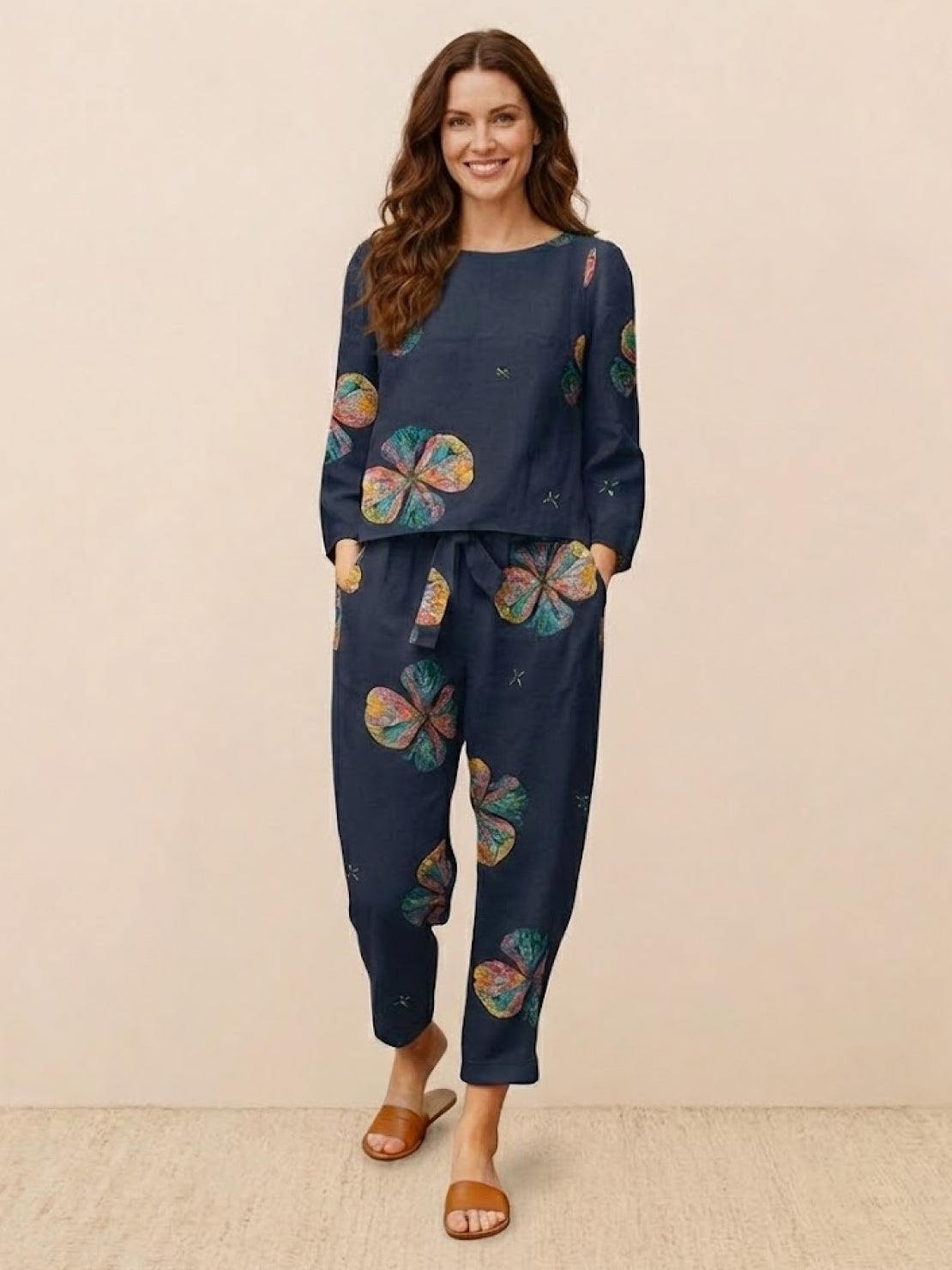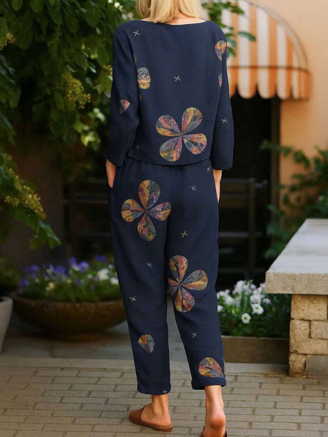 The matching set is ideal for casual outings and semi-formal events when you accessorize with dressier shoes and jewelry.